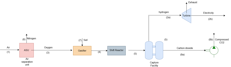 4. Capture facility: The gas leaving the shift reaction (Figure 2, stream 5) is then directed to the capture facility. Here, hydrogen is separated for use in the gas turbine to produce electricity, while the carbon dioxide is captured, compressed (Figure 2, stream 8a), and sent to a geological storage site (Figure 2, stream 8b).