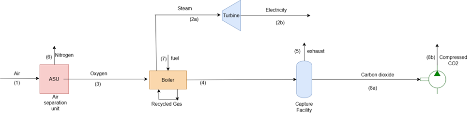 The process begins with air entering the Air Separation Unit (ASU), where oxygen is separated from nitrogen. The high-purity oxygen is then fed into the boiler along with the fuel. Since nitrogen has been removed upstream, only oxygen and fuel enter the combustion chamber. Burning the fuel in pure oxygen results in much higher temperatures than traditional air-based combustion. These elevated temperatures can be problematic, as the construction materials of the combustion chamber may not withstand the heat. To address this challenge, part of the exhaust gases from the combustion process is redirected back into the boiler. This dilution of the inlet gas helps control the temperature and prevents the chamber from overheating, with the recycled gases effectively acting as an inert cooling agent.