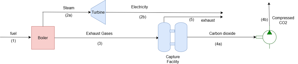 In this process, whether the fuel used is natural gas, coal, or another type, the fuel is typically burned in a boiler to produce high-pressure steam (Figure 1, Stream 2a), which drives the turbine. Instead of allowing the exhaust gases to be directly released into the atmosphere, the gases are directed to a capture facility through (Figure 1 Stream (3)). Exhaust gases leaving the boiler contain CO₂, nitrogen, excess hydrogen, and water vapor. The capture system filters out the nitrogen, oxygen, and water, leaving behind concentrated CO₂ (Figure 1, stream 5), which is then sent to the plant’s exhaust. The captured CO₂ (Figure 1, Stream 4a) is then compressed and transported to a geological suitable location (Figure 1, stream 4b), typically located in deep underground production wells, where it is stored securely.